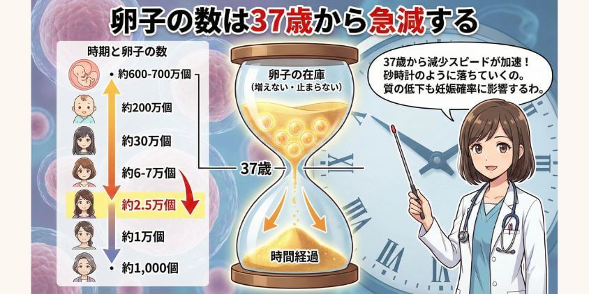 卵子は新しく作られることはなく、女性が持って生まれた卵子が年齢とともに減少・劣化していくため、これは避けられない現実よ。
