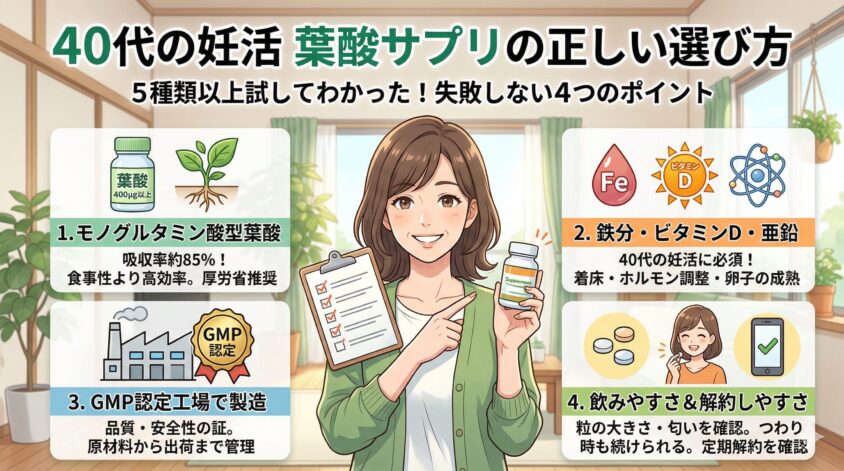 ここまで読んでくれたあなたなら、葉酸サプリの選び方はもうバッチリ理解できたはず。成分量・飲みやすさ・コスパ・安全性の4つの基準で選べば、大きな失敗はないよ。