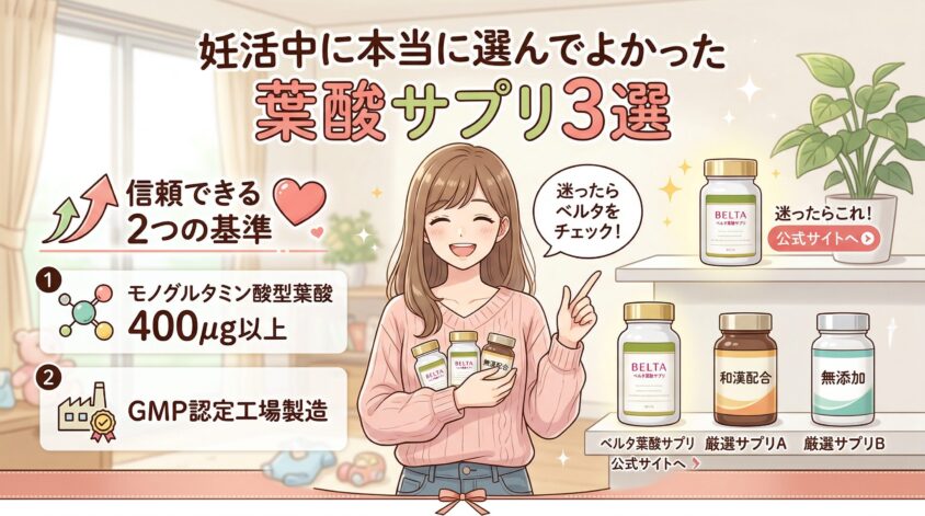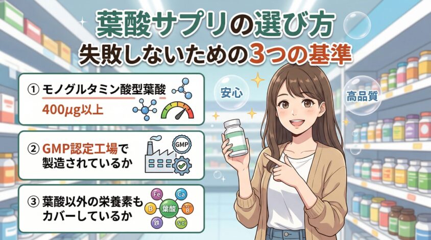 結論から言うと、葉酸サプリを選ぶときに外せない基準は3つ。この3つを押さえておけば、少なくとも「ハズレ」を引くことはない。