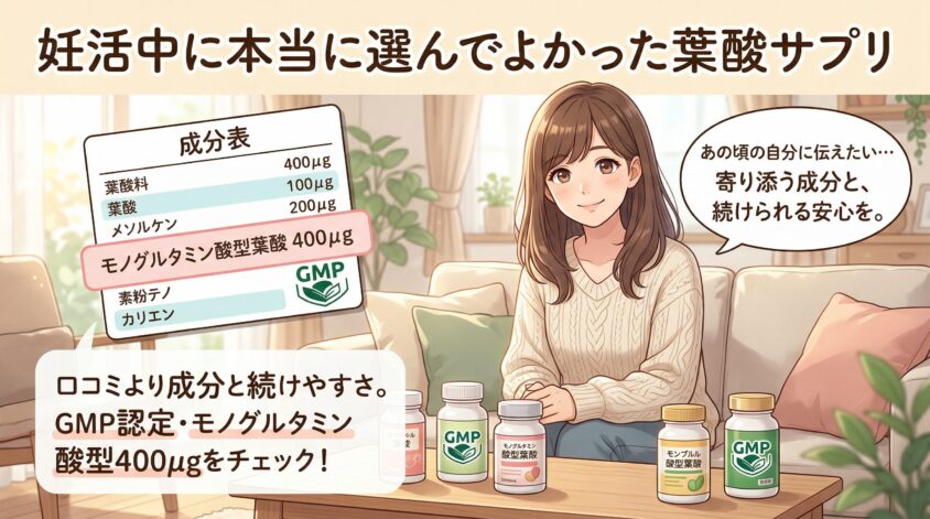 あの頃の自分に会えたら「まず成分表を見て。モノグルタミン酸型葉酸400μg、GMP認定、それだけ確認すればいいから」って言ってあげたい。