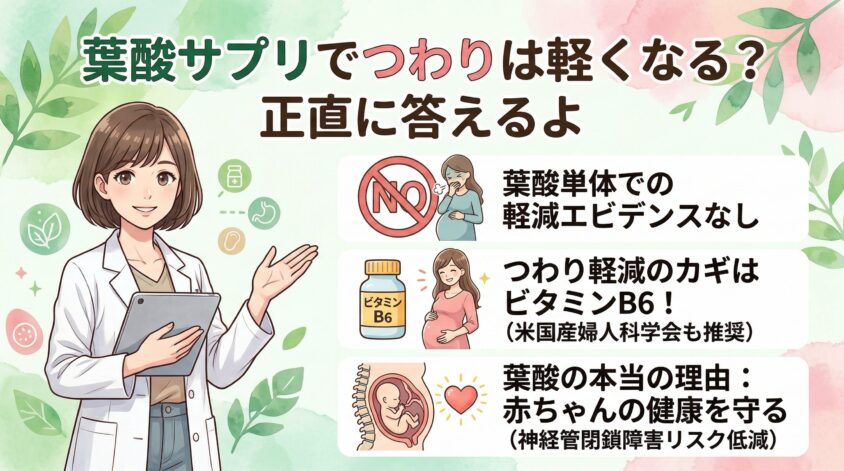 結論から言うと、「葉酸を飲めばつわりが軽くなる」という直接的なエビデンスは、現時点ではない