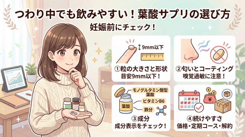 • つわり中でも飲めるように、粒の大きさ・匂い・サポート体制もチェック