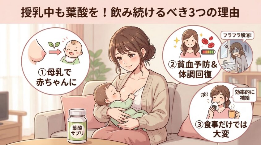 でもね、授乳中こそ葉酸が必要な時期なの。その理由を3つ、しっかり説明させてね。
