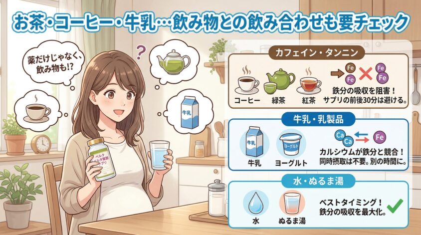 カフェインは鉄分の吸収を阻害する作用がある。ベルタ葉酸サプリには鉄分が23.2mg含まれているから、サプリの前後30分はカフェイン飲料を避けるのがベター