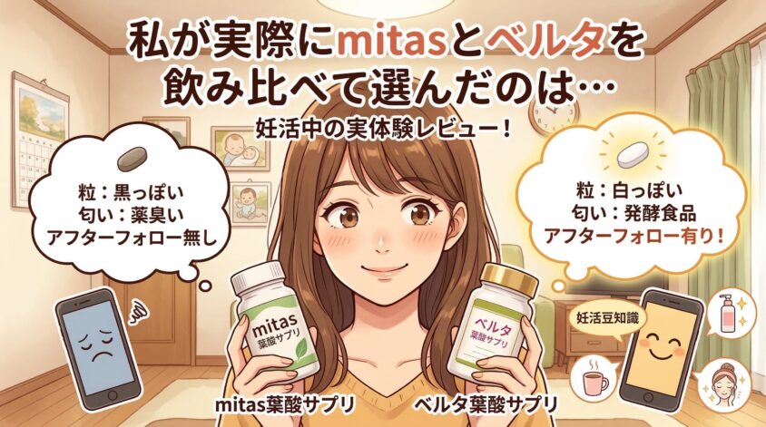 この記事では、妊活3年+不妊治療2年を経験し、実際にmitas葉酸サプリとベルタ葉酸サプリを両方買って飲み比べた私が、「嘘」「怪しい」と言われる理由を一つずつ検証していくよ。