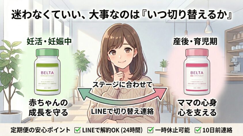ベルタシリーズのいいところは、同じブランド内でステージに合わせてサプリを切り替えられること。他社だと「妊活サプリを解約→別ブランドの産後サプリを探す→比較→申し込み」という手間がかかるけど、ベルタなら「LINEで切り替え連絡」で完了する。