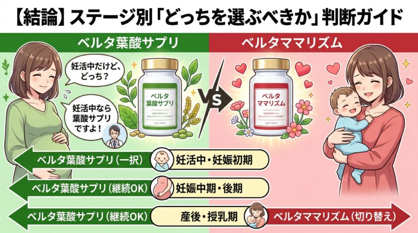 まず最初に結論から言うね。ベルタ葉酸サプリとベルタママリズム、この2つは「どっちが優れているか」という比較の話じゃない。