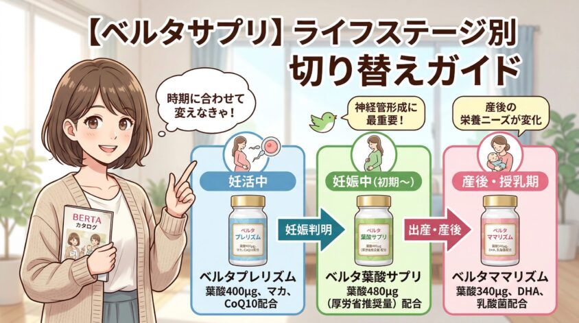 同じ「ベルタ」でも時期によって葉酸の量や配合成分が違うわ。だからこそ、ライフステージに合わせた切り替えが大切なの。