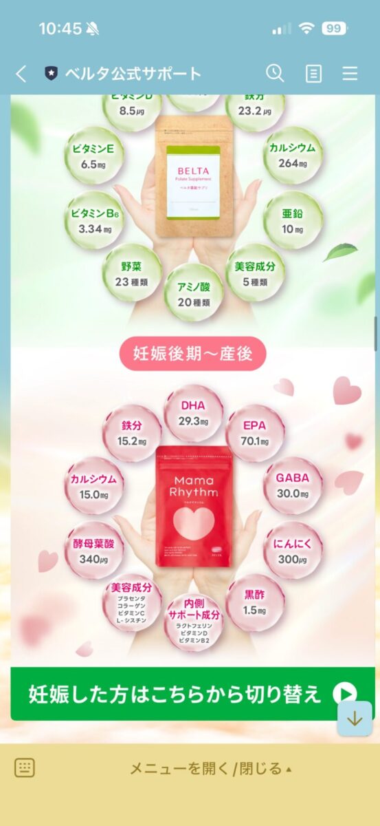 「この飲み方で合ってるのかな」「いつまで飲めばいいんだろう」「妊娠したら切り替えるべき?」――そういう疑問が出てきた時、ベルタはLINEやメールで情報を届けてくれた。mitasはシーンとしていた。