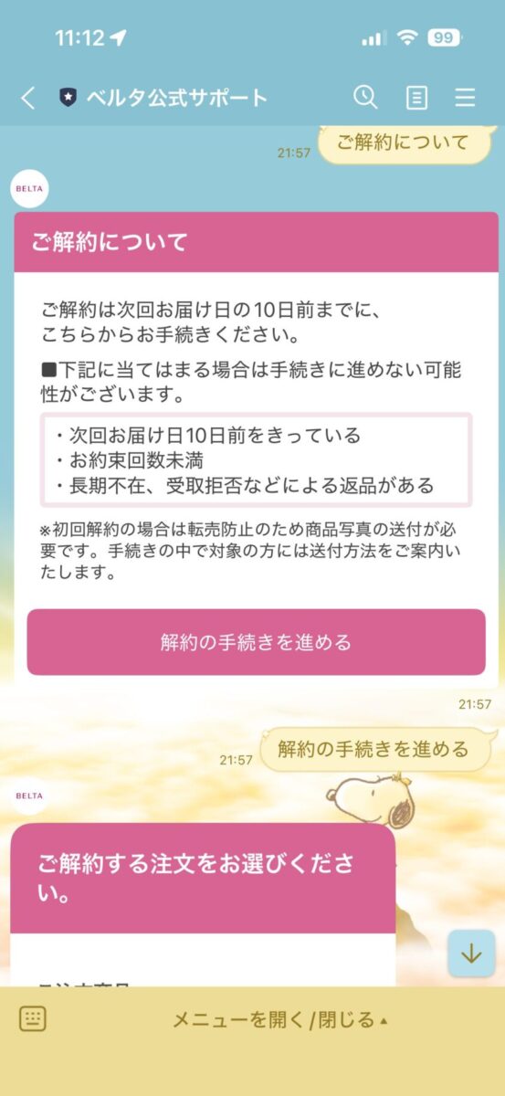 トーク画面で「解約したい」と送ると、自動応答で手続きの案内が始まるよ。
