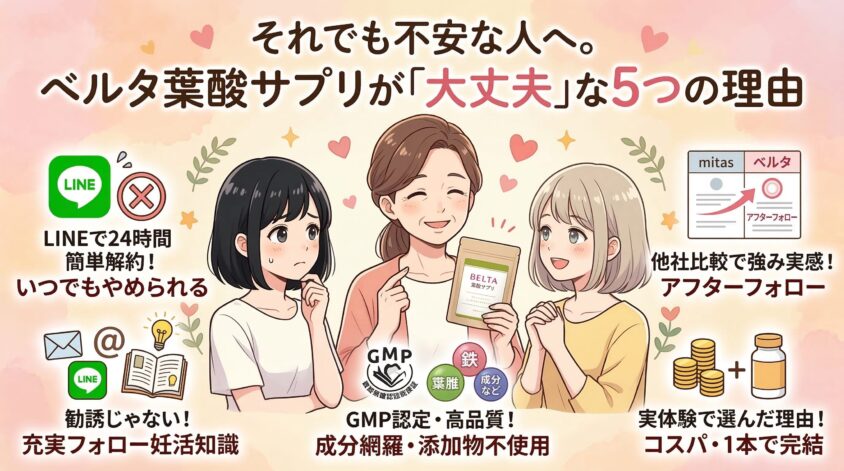 だから最後に、ベルタ葉酸サプリを選んで「大丈夫」だと言い切れる5つの理由を伝えるね。