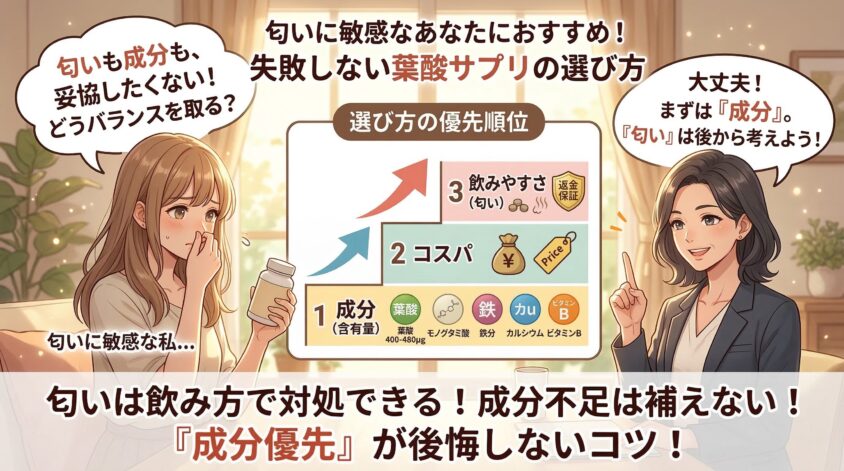 匂いが少ないサプリを選びたい気持ちはあるんですけど、成分とかコスパも妥協したくなくて……。どうバランスを取ればいいですか?