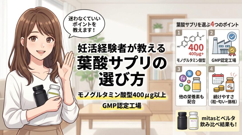 - サプリ選びのコツ:モノグルタミン酸型葉酸400μg以上・GMP認定・続けやすさの3点で選ぶ