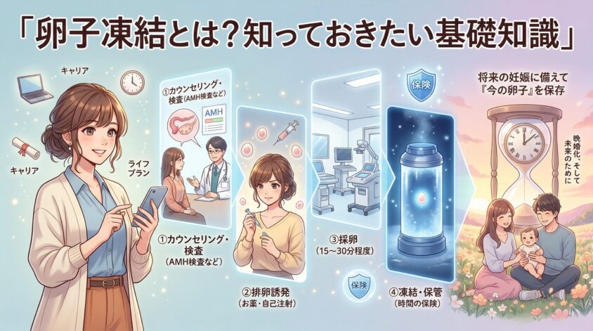 卵子凍結は、将来の妊娠に備えて「今の卵子」を保存する技術。加齢による卵子の質の低下を防ぐための、いわば「時間の保険」だよ。