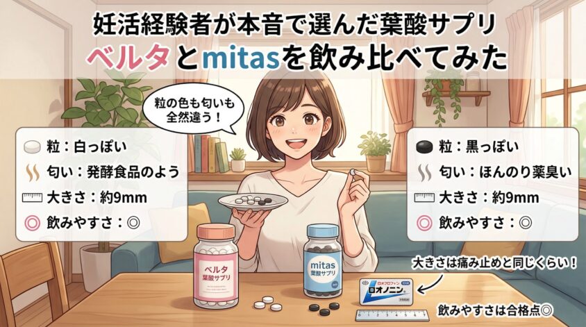 そんなサプリジプシーだった私が最終的に落ち着いたのが、ベルタ葉酸サプリ。比較対象としてmitas(ミタス)葉酸サプリも実際に飲んだから、両方の正直な感想を書くね。