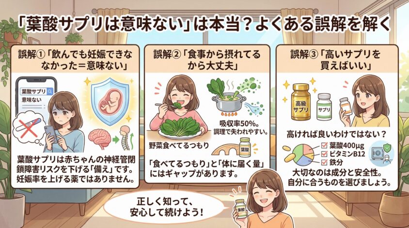 これ、一番多い誤解かもしれない。「葉酸サプリを飲んだのに妊娠できなかった。だから意味なかった」という声。