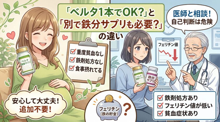 上記に全部当てはまるなら、ベルタ1本で安心して大丈夫。鉄分23.2mgは妊娠中後期の推奨量(16mg/日)を十分にカバーしているし、食事からの鉄分摂取と合わせれば、追加のサプリは不要だよ。