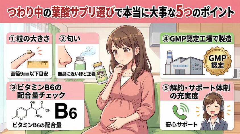 改めて整理すると、つわり中の葉酸サプリ選びで見るべきは「ビタミンB6配合・小粒・匂いが少ない・GMP認定・サポート体制」の5つ。