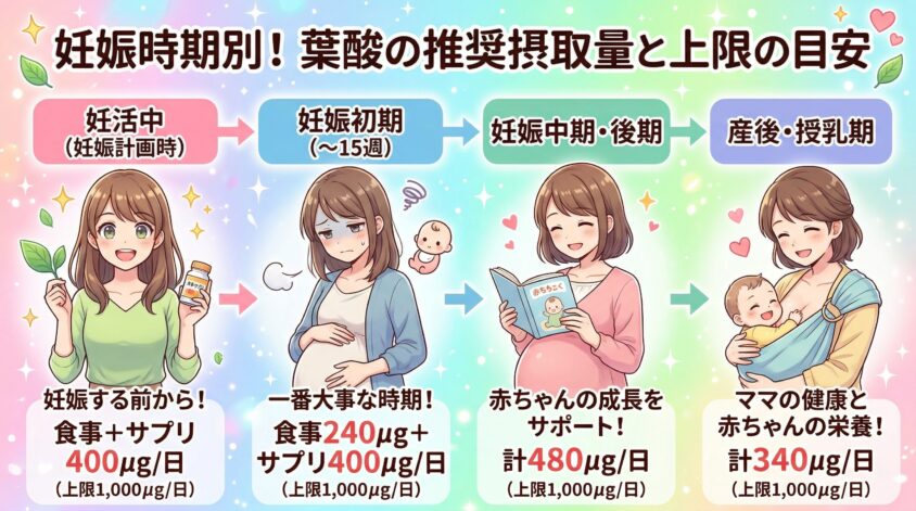 妊娠時期別・葉酸の推奨摂取量と上限の目安