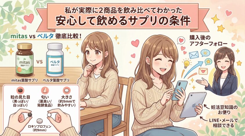 ここからは、私が実際にmitas葉酸サプリとベルタ葉酸サプリの2つを飲み比べた体験を話すね。