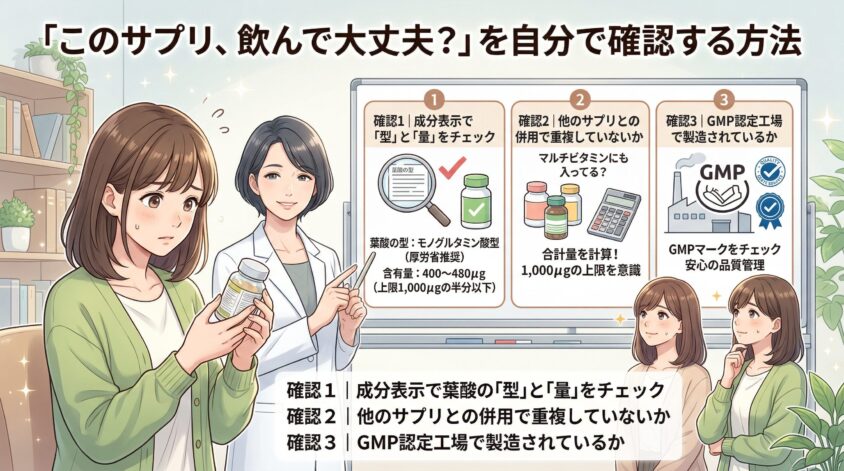 だから、注意すべきは「サプリの重複摂取」だけ。マルチビタミンにも葉酸が入っていることが多いから、複数のサプリを飲んでいる場合は合計量をチェックしてみて。