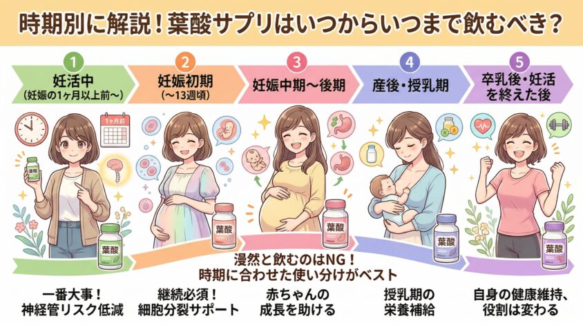 | 産後・授乳期 | 葉酸+鉄分 | 産後向け or ママ向けに切り替え |
