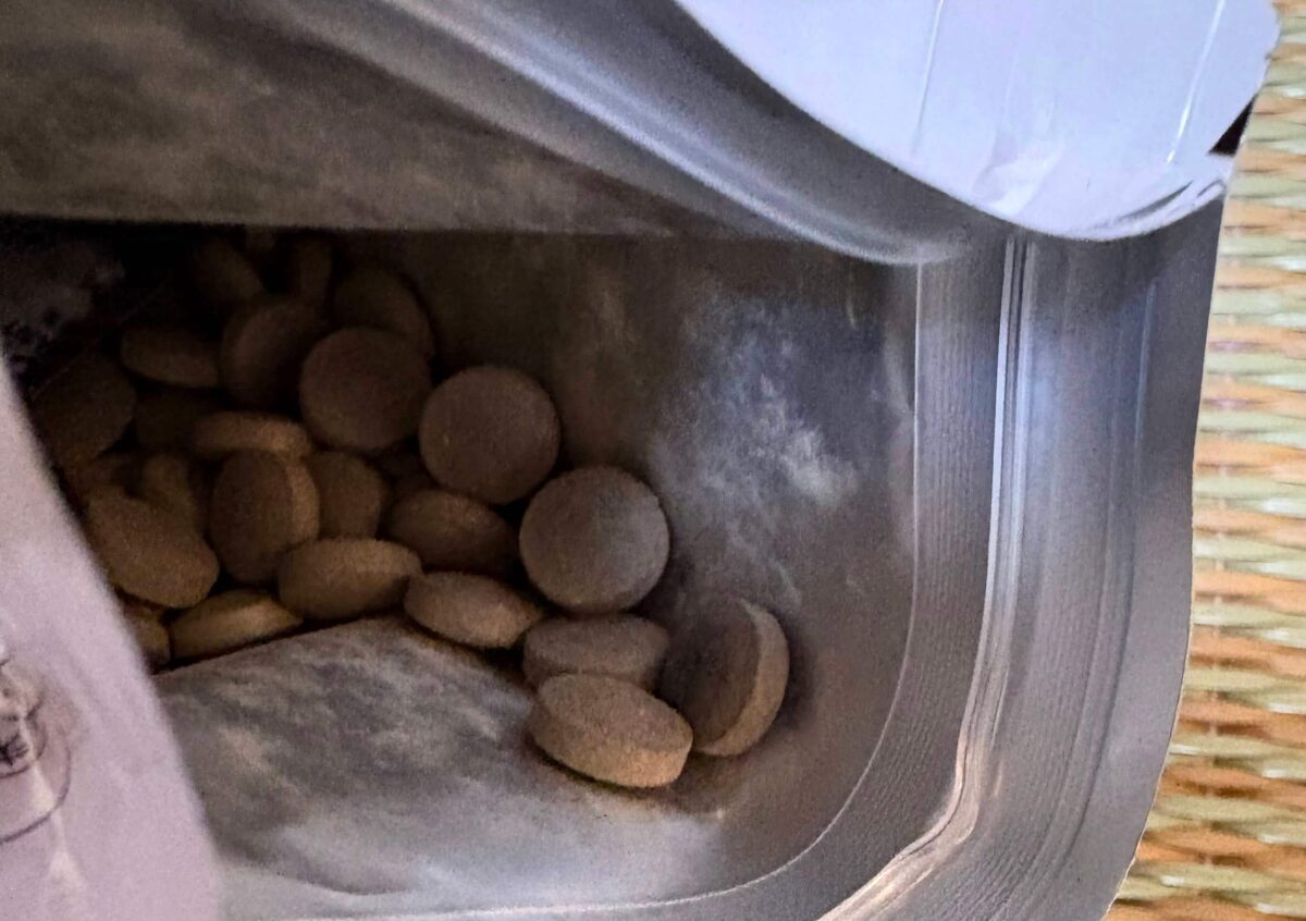 mitas葉酸サプリは下写真の通り、色が黒っぽくて見た目は独特ですが、匂いや味はあまり気にならず粒が小さいので飲みやすかったです。