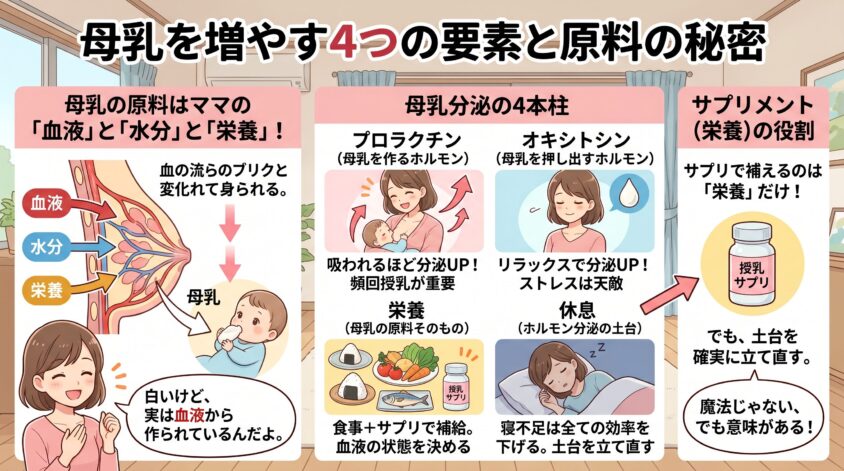 • サプリに頼るだけじゃなく、母乳量を支える「生活の4本柱」