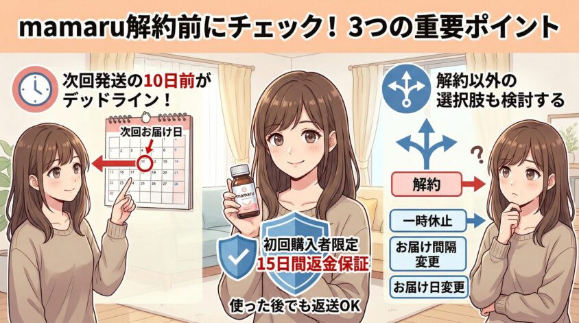この記事では、mamaruの具体的な解約手順はもちろん、解約前に知っておくべき注意点、そして解約後に「次のサプリどうしよう」という悩みまで、全部まとめて解決するよ。
