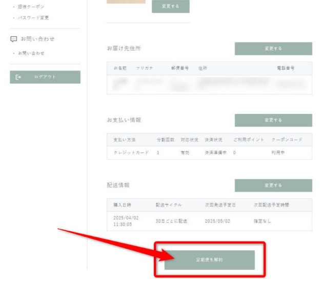 マイページにログインしたら、定期コースの管理画面を開こう。そこに「解約」や「定期便を停止する」といったメニューがあるから、そこをタップ。