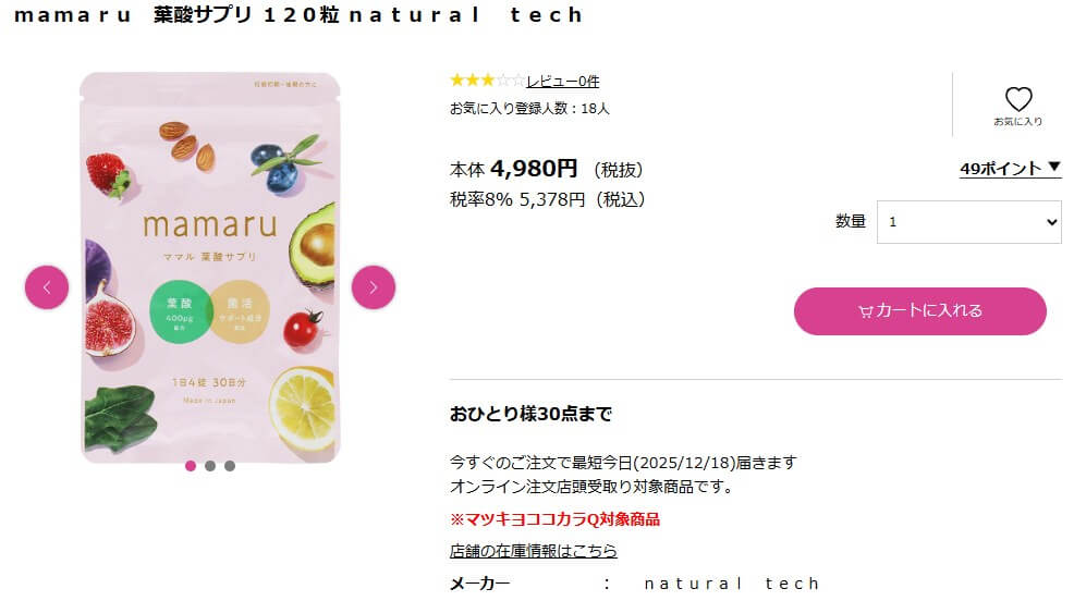 mamaru(ママル)葉酸サプリはスギ薬局やマツキヨで買えますが、価格は割引のない5,378円(税込)です。