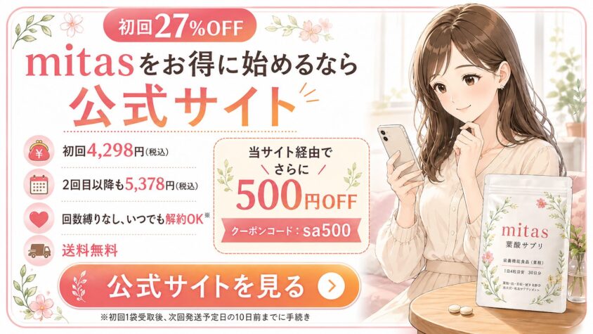 mitas葉酸サプリは、公式サイトの定期購入※が最安値ですよ。