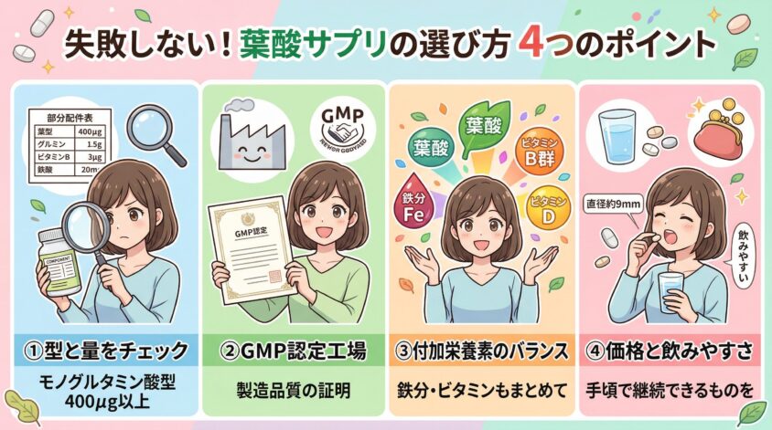 - サプリは「モノグルタミン酸型葉酸400μg以上・GMP認定・鉄分配合」を基準に選ぼう