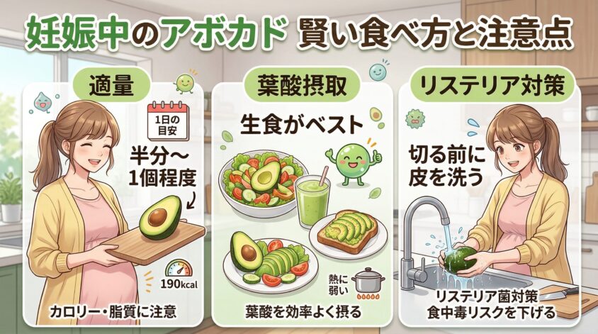 妊娠中は免疫力が低下しやすくなるため、通常より食中毒リスクが高まるの。アボカドの皮にはリステリア菌が付着している可能性があるから、切る前に必ず皮をしっかり水洗いすること。清潔なまな板と包丁を使うことも忘れずにね。