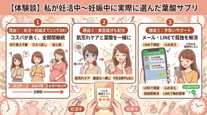 妊活用・妊娠初期用・中期後期用…とステージごとにサプリを切り替えるのは正直面倒だし、その都度リサーチするのも大変。ベルタ葉酸サプリ妊活中から妊娠中まで通して飲める設計だったから、「これ1つでいい」という安心感があった。