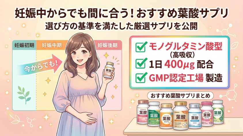 ある。神経管形成の時期は過ぎていても、葉酸は赤血球の生成や胎盤の機能維持に関わっている。中期以降は貧血になりやすい時期でもあるから、葉酸と鉄を一緒に摂れるサプリを選ぶのがおすすめ。産後の体力回復にも関わるから、どのタイミングでも始める価値は十分にあるよ。